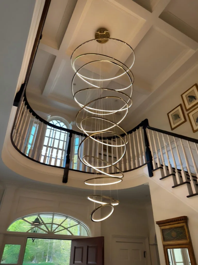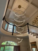 Designed for large, high-ceiling spaces like entryways, grand staircases, and living rooms, the CD11’s sheer scale makes it unforgettable. The rings span numerous sizes, from 300mm up to 1500mm, creating a stunning sculptural drop. The Gold stainless steel construction catches the light beautifully, whether the fixture is on or off. This cascading, multi-ring design is more than a light; it is a permanent piece of modern, kinetic sculpture that will define the luxury aesthetic of your entire home.